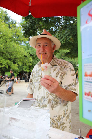 Ein Eisblock wird mit einem speziellen Hobel zu feinem geriebenen Eis geschabt, es entsteht "Schnee" der dann in einem Becher mit Fruchtsirup verfeinert wird. Zitrone, Erdbeere, Himbeere, Mango, Kokosnuss, Orange, grüner Apfel, sind einige der Sorten am Stand, es gibt auch mal Cola oder Schlumpf-Eis :)